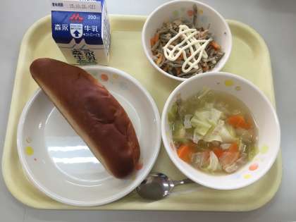 今日のメニューは、黒糖パン・えびと野菜のスープ煮・ごぼうサラダ・ノンエッグマヨ・牛乳でした。