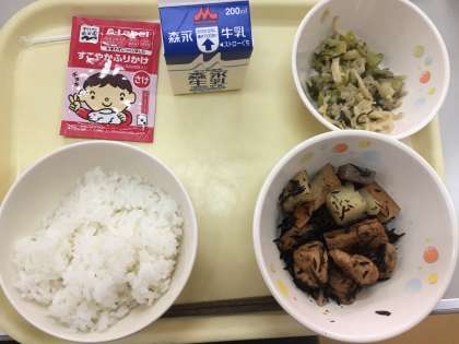 今日のメニューは、ごはん・いそ煮・切り干し大根のごまあえ・ふりかけ・牛乳でした。
