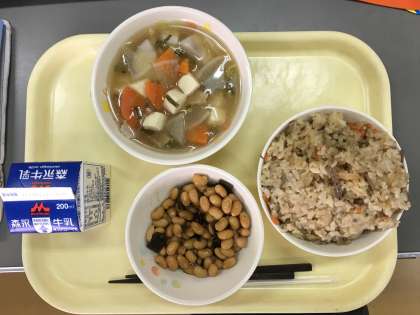今日のメニューは、かやくご飯・のっぺい汁・昆布豆・牛乳でした。