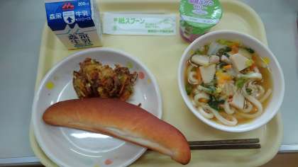 今日のメニューは、フィンガーパン・あんかけうどん・かき揚げ・ぶどうゼリー・牛乳でした。