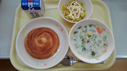 今日のメニューは、デニッシュパン・かぶのクリーム煮・大豆の華サラダ・ノンエッグマヨ・牛乳でした。