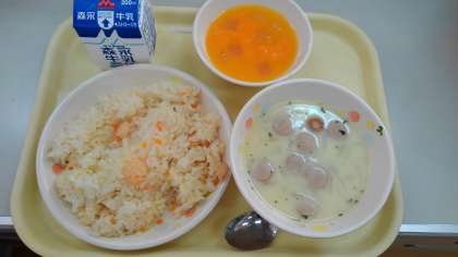 今日のメニューは、えびピラフ・クリーミースープ・オレンジパンチ・牛乳でした。
