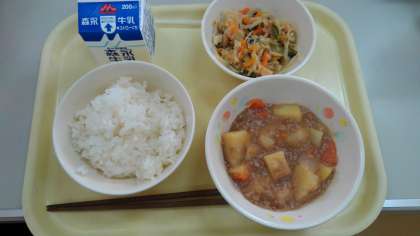 今日のメニューは、ごはん・じゃがいものそぼろ煮・切り干しと青菜炒め・牛乳でした。
