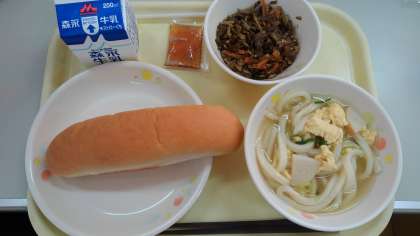 今日のメニューは、ベビーパン・たまごうどん・くきわかめいりきんぴら・イチゴジャム・牛乳でした。