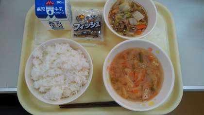 今日のメニューは、ごはん・みそ汁・中華丼・ミニフィッシュ・牛乳でした。