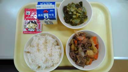 今日のメニューは、玄米ごはん・肉じゃが・しろ菜と平天の煮びたし・ふりかけ・牛乳でした。