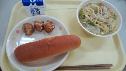 今日のメニューは、黒糖パン・ちゃんぽん・あげシューマイ・牛乳でした。