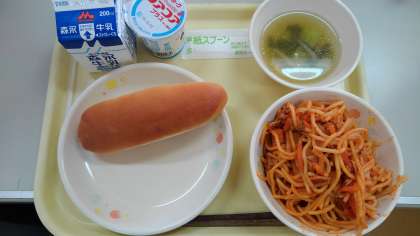 今日のメニューは、ベビーパン・スパゲティナポリタン・チンゲン菜のスープ・ヨーグルト・牛乳でした。