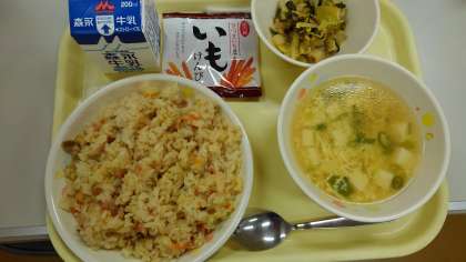 今日のメニューは、やきめし・五目たまごスープ・青菜の油炒め・いもけんぴ・牛乳でした。