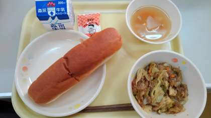 今日のメニューは、コッペパン・春雨のひき肉炒め・大根のスープ・ミルクバター・牛乳でした。