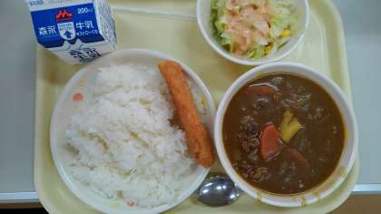 今日のメニューは、ごはん・カレーシチュー・イカフライ・キャベツとコーンのサラダ・サウザンドレッシング・牛乳でした。