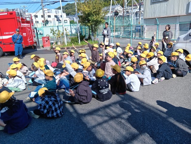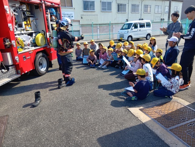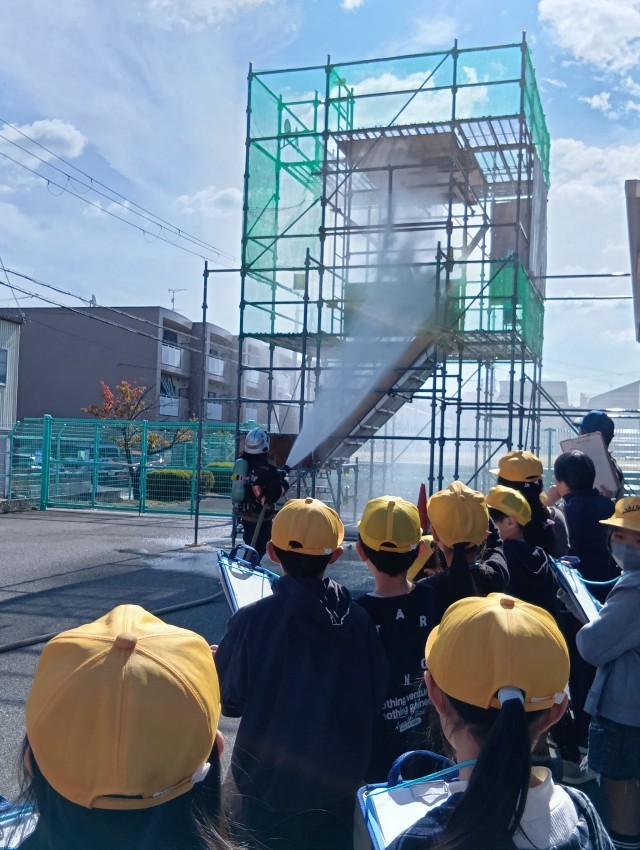 施設内や消防車救急車を近くで見て、放水の様子も見て、その後質問をたくさんしていました。