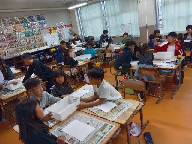 マーブリングの授業です。うまく模様が出るといいなと思います。
