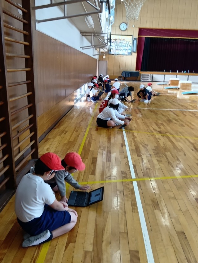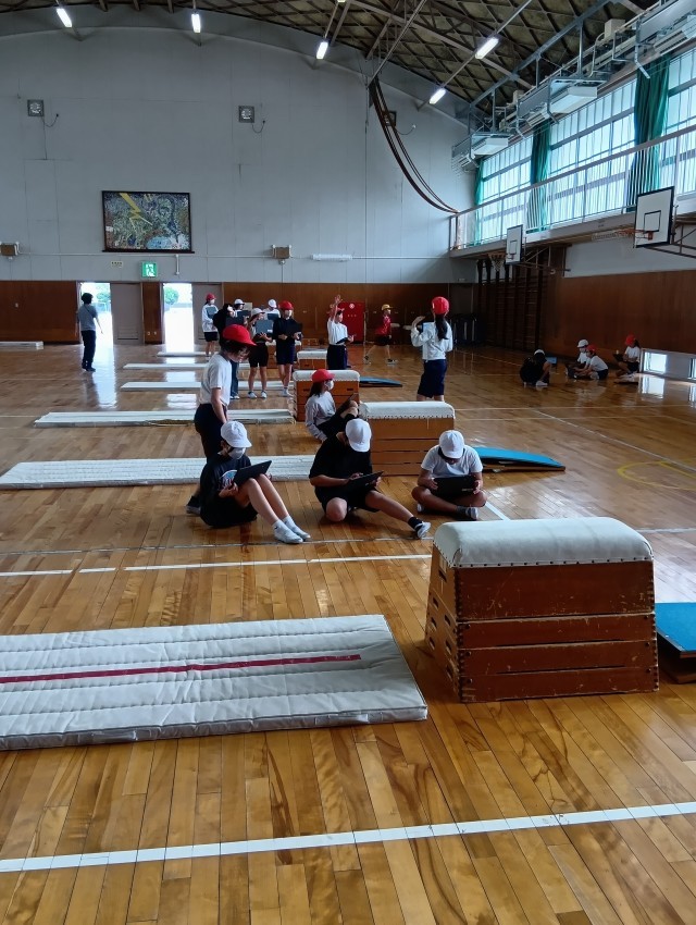 1組は体育の授業。集まって何してるのかなと思い質問したら、アドバイスの観点とその内容をタブレットに書いていると教えてくれました。すぐ共有できるので便利そうでした。その後、実際に跳んでうまくできてるところをさらに助言していました。