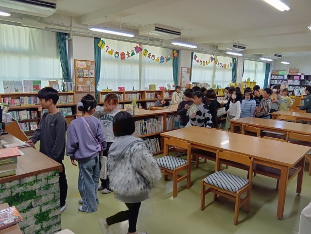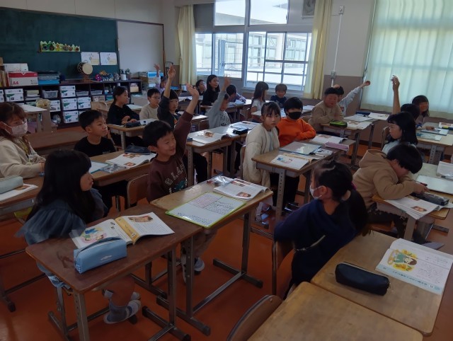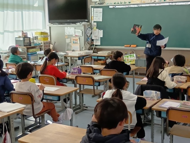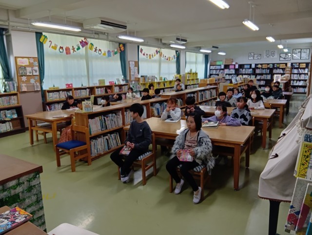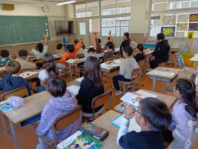 3組は図書の授業で、司書の先生から読み聞かせをしてもらっていました。真剣な表情でしっかり聞いていたので、物語を聞くのが好きな子が多くていいなと思いました。