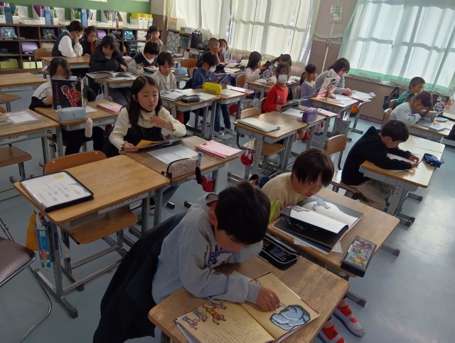1組は国語の授業で教科書に載っている作者の別の作品をたくさん用意してある中から一つ選んで読み、共通することを見つけましょうという課題に取り組んでいました。静かに集中して読んでいました。