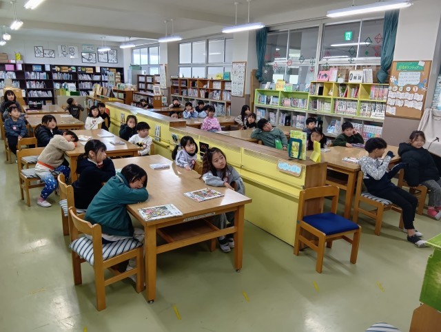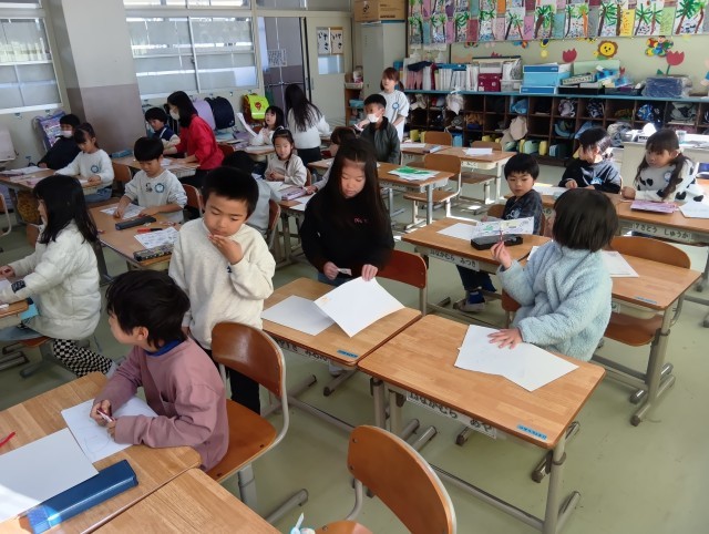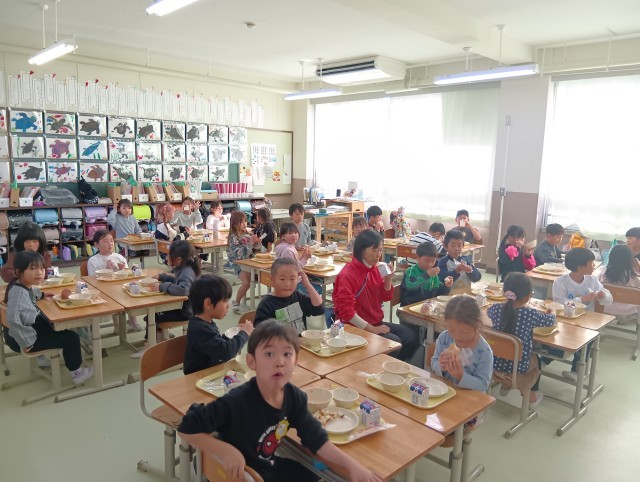 1組図書の読み聞かせ、2組給食の時間、3組図工で描いた絵の整理をしていました。