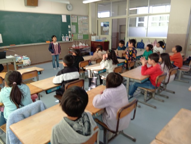 2組は国語で冬休みの思い出を一人ひとりスピーチしていました。スピーチも上手でしたが、その後の質問と答えがよくできていてすごいなあと思いました。
