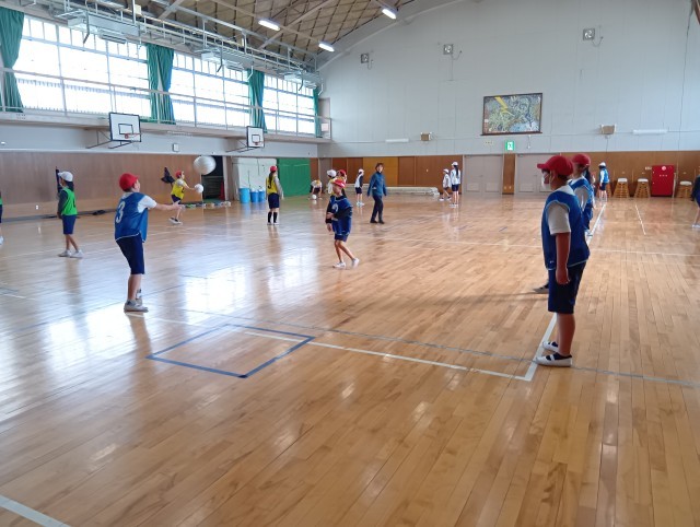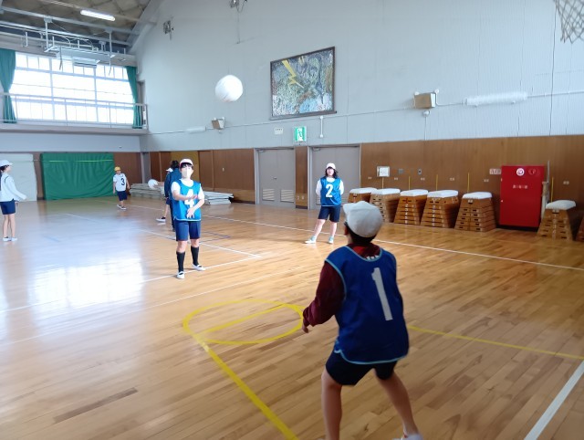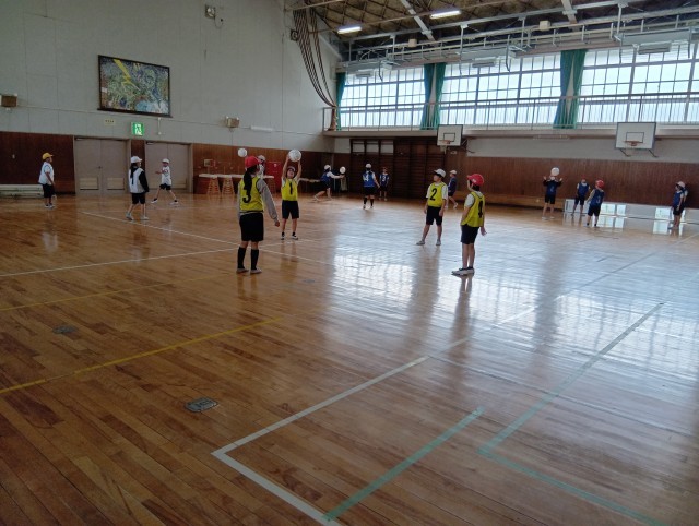 1組は体育。自分たちでボールを確実にキャッチできるようにしたいと考えて、その練習をしていました。