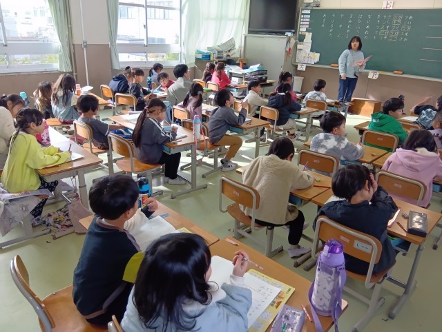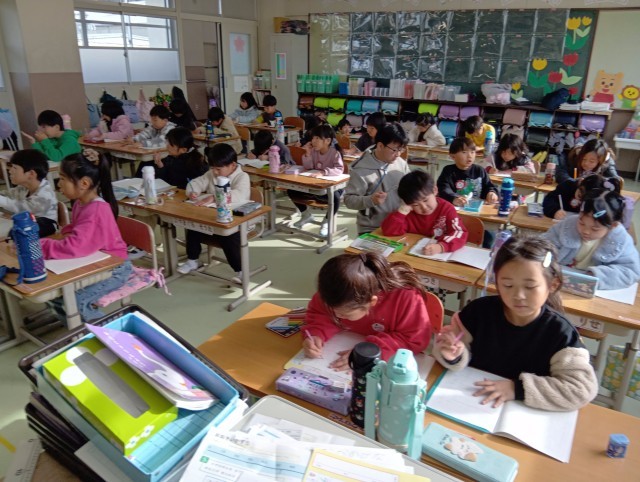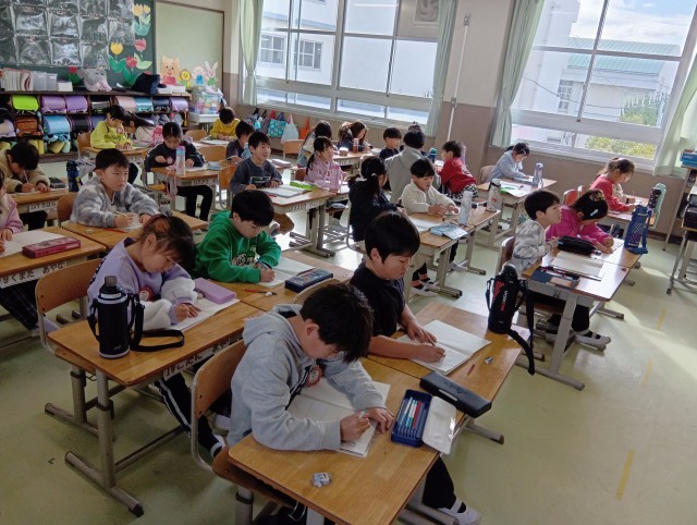 1組は国語。カタカナの学習で、ひらがなと似た形のものを見つけていました。