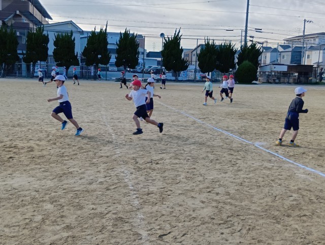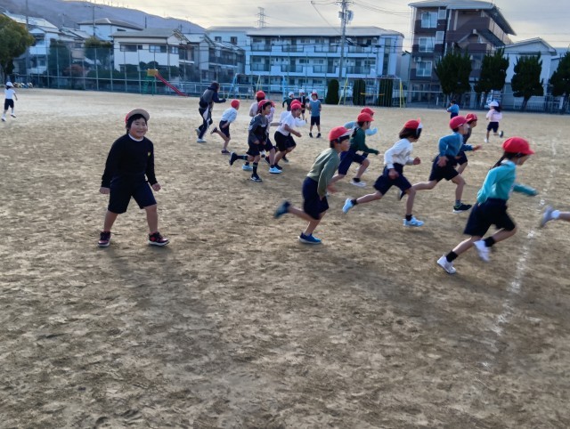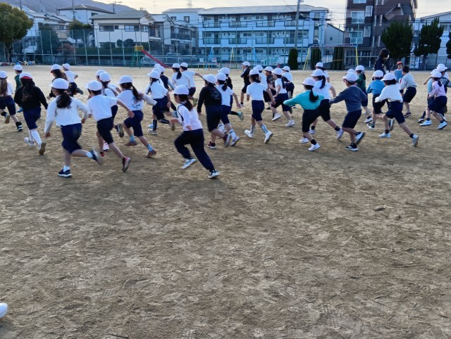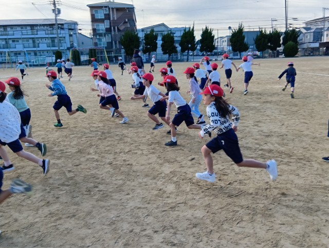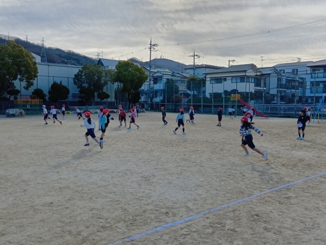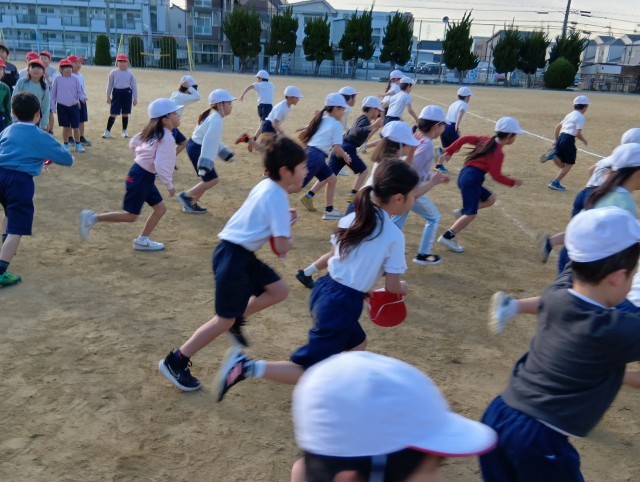 全クラス揃って運動場で体育の授業を受けていました。朝から鬼ごっこで身体を温めていました。