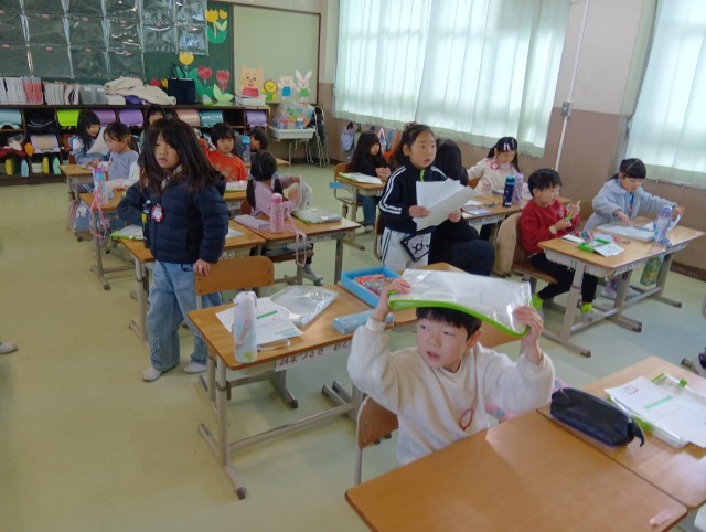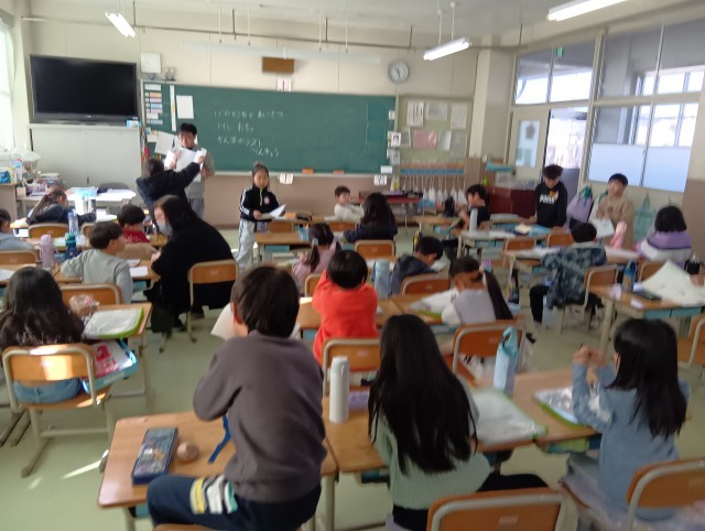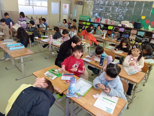 1組は学級活動です。配られたプリントを片付けたり、話を聞くときには聞くという切り替えが上手になっています。その隙間に色々と教えてくれるお話も上手でした。