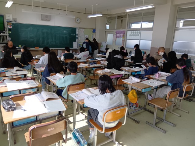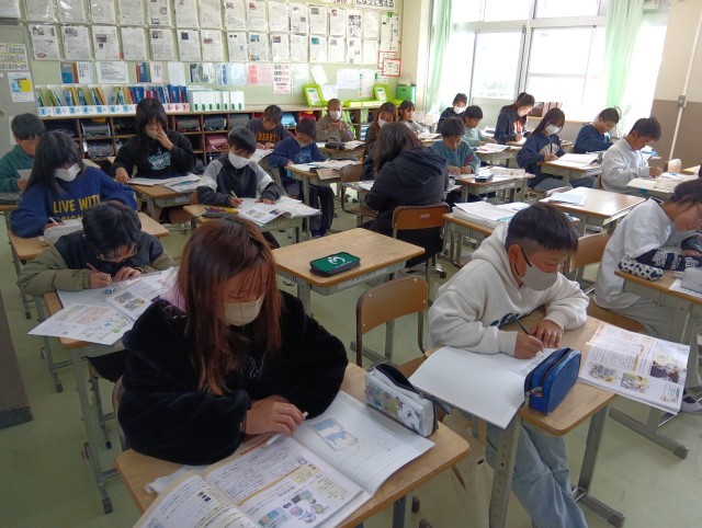 1組は社会。大量データを読み取って、大事だと思う部分をまとめて、自分なりの考察も入れてレポートを作る⋯という授業です。よく調べてがんばっていると思います。