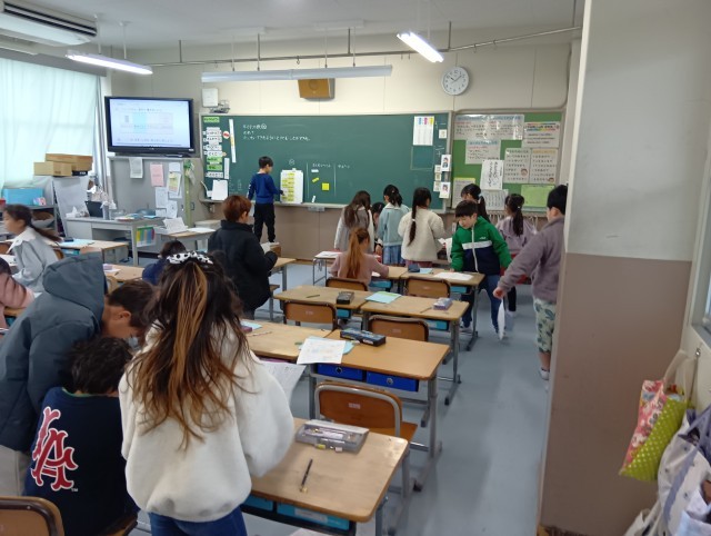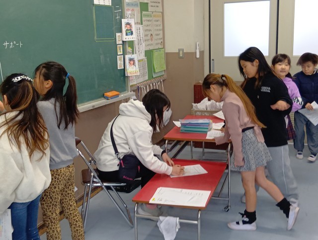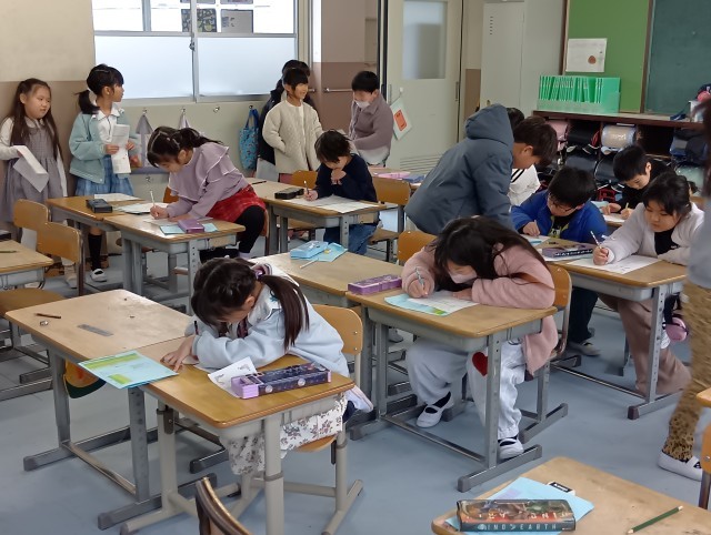 1組は算数。4桁の数字の読みとりに挑戦していました。全問正解してガッツポーズする子もいて、前向きな気持ちでがんばっていました。