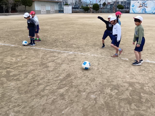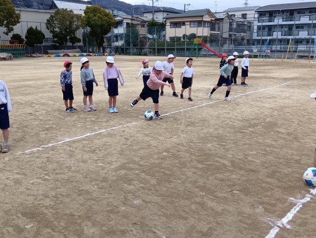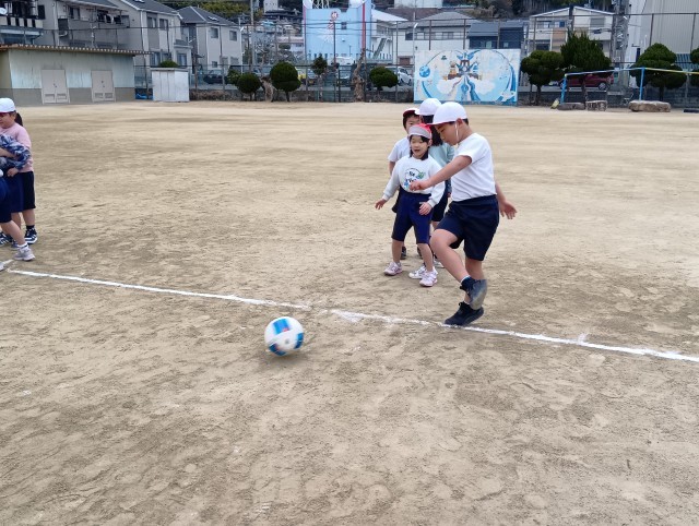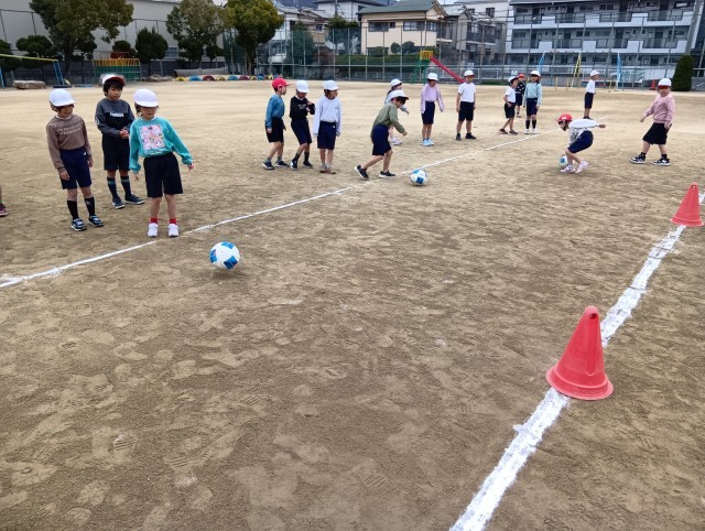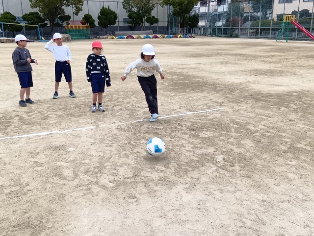 2組は体育。ボールを蹴って的に当てようとしていました。「当てたい」という気持ちがすごく見えました。じょうずになるといいなと思います。