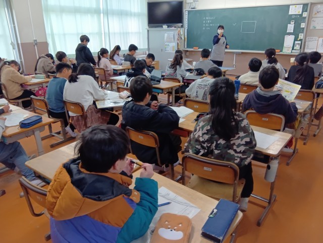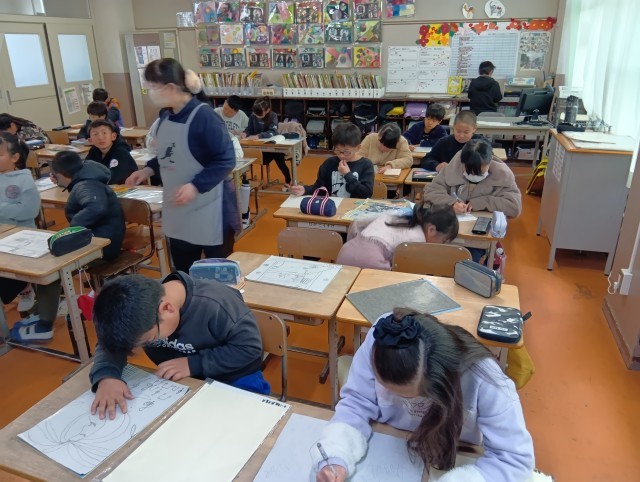 1組は図工。彫刻をするための元になるデザインを描いているところでした。一人ひとりの個性が出ていていい感じです。