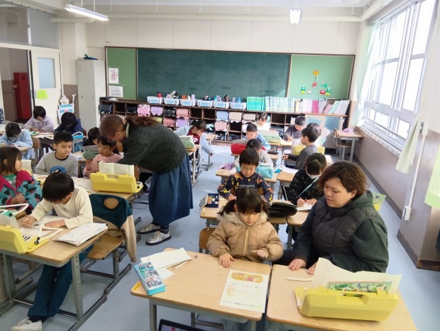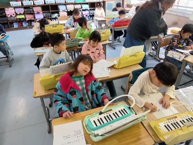 2組は音楽。演奏して歌を歌って、その後は音符を書く練習をしていました。たくさん書いてどんどん上手になっています。