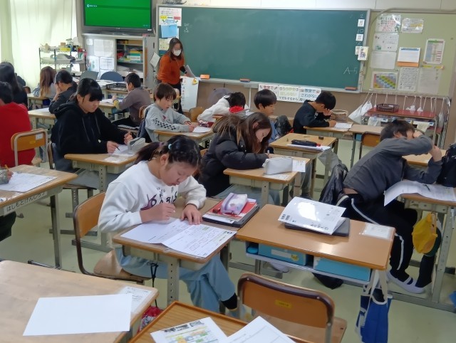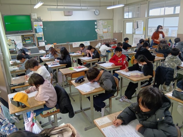 2組も算数。3組と同じ学習内容をテストで確認していました。言葉と数字と図を行ったり来たりするけれど、あきらめず真剣に解いていました。
