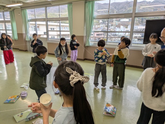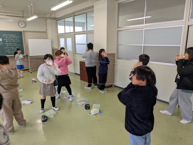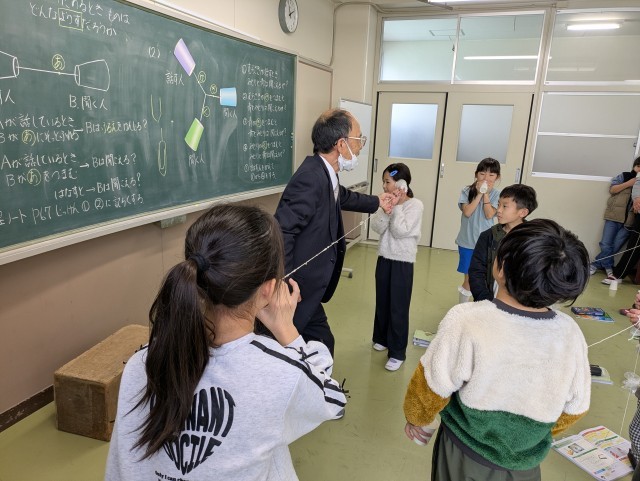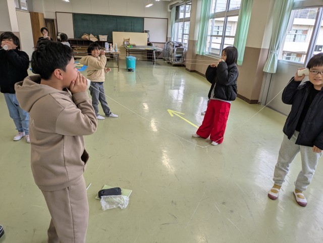 3組は理科。糸電話で声を伝えることと、糸を触ると音が変わるのかどうかを実際にやってみて確認していました。楽しそうに実験していましたあ