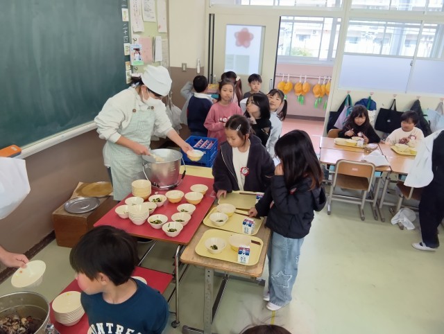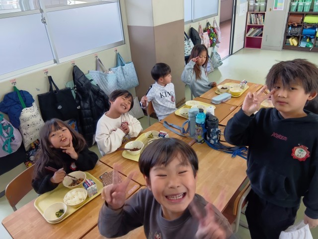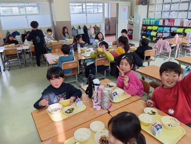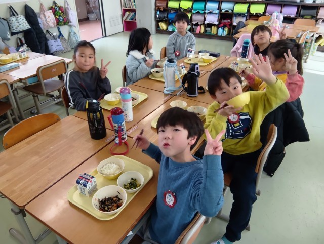 1組。どのクラスも給食の時間の仕事の仕方や、食べる時や片付ける時の方法にすっかり慣れて「当たり前」になっています。