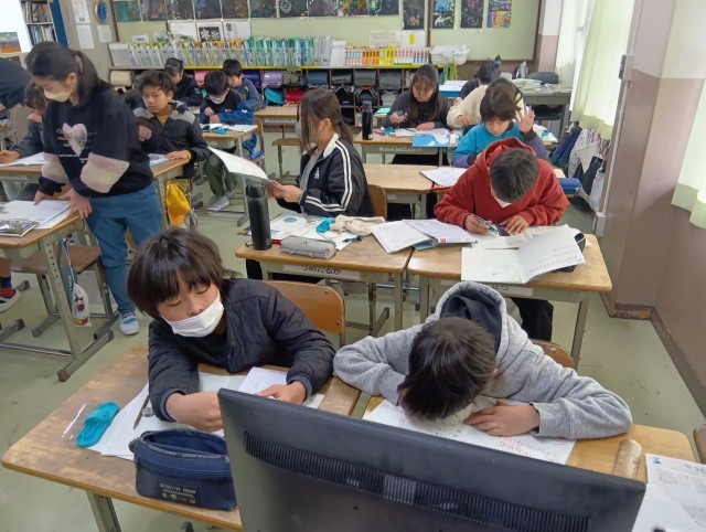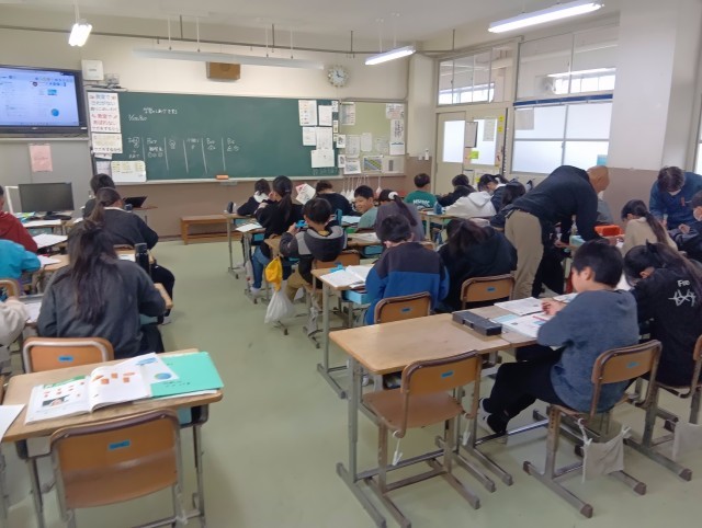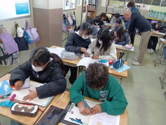 3組は算数。コンパスを使って図形の問題を解いていました。あれこれ試行錯誤しながら取り組んでいました。
