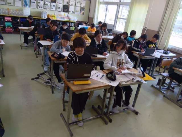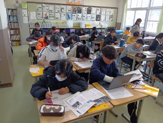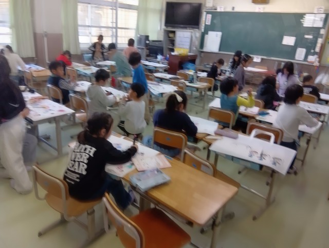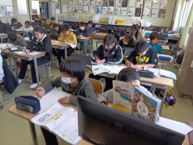 3組は社会科。調べてまとめる課題を何度か取り組んでいますが、書く文章や図表に特色、個性が出てきました。