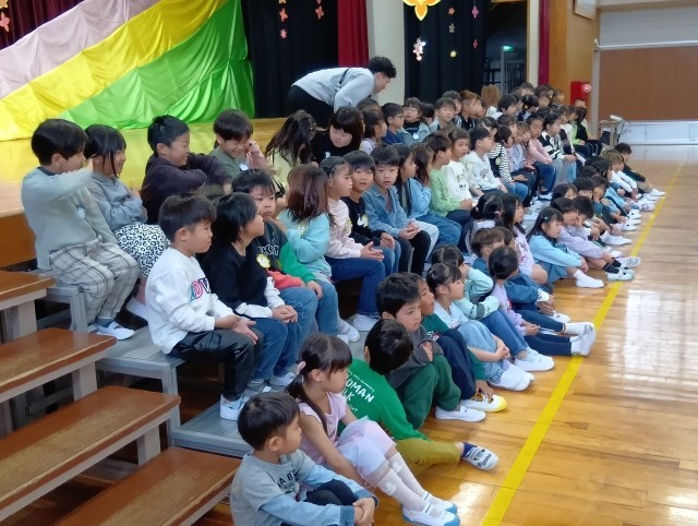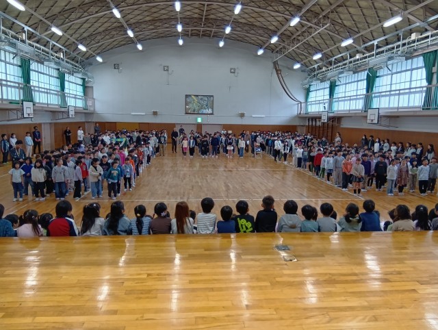 はじめて四条小の6学年全体で集まって、対面式を行いました。在校生からは校歌と歓迎の言葉を、1年生からは歌とよろしくお願いしますの言葉を送り合いました。
