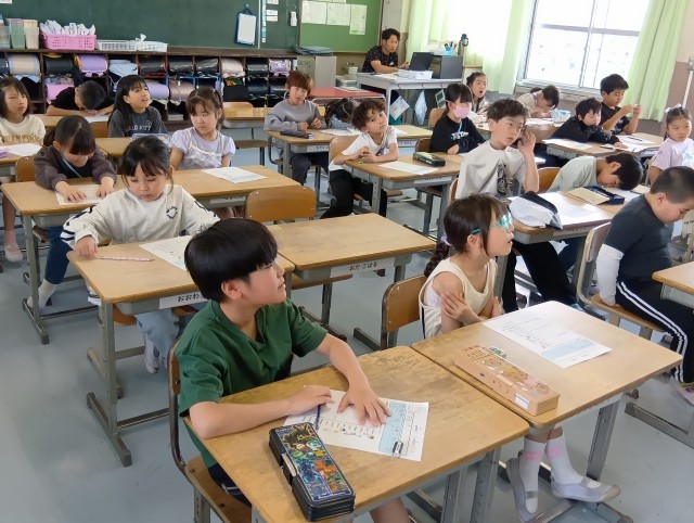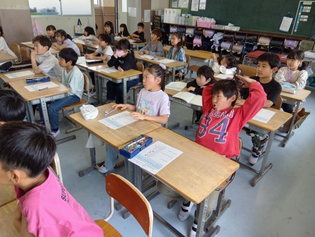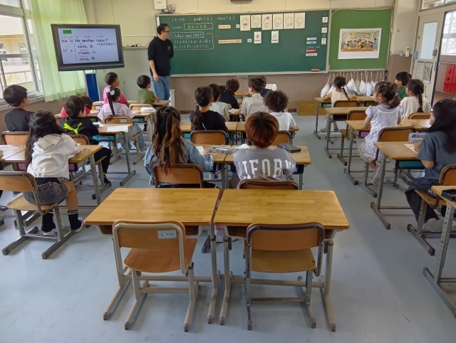 3組は英語。天候を表す言葉について、ゲーム感覚で楽しみながら取り組んでいました。しっかりとした声で発音してすごいなと思いました。