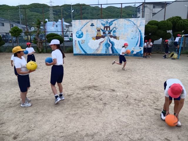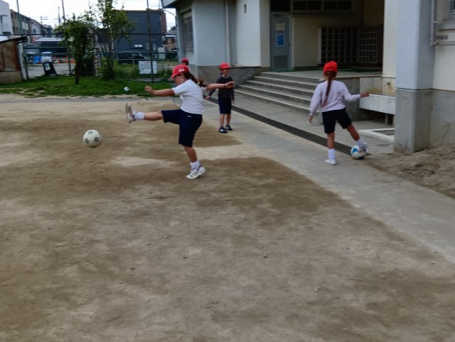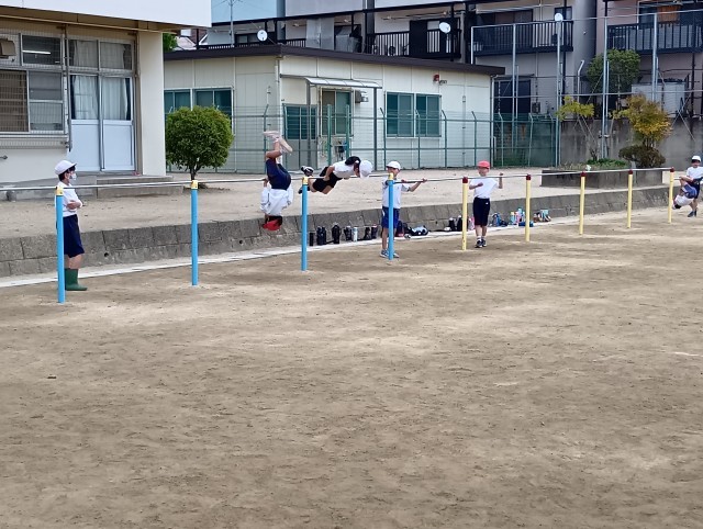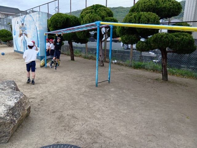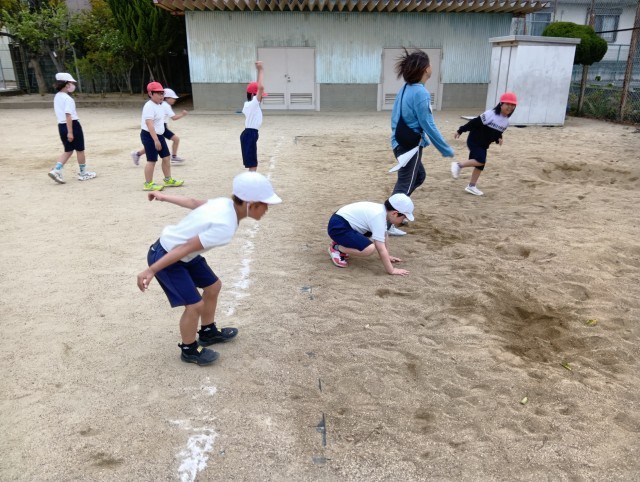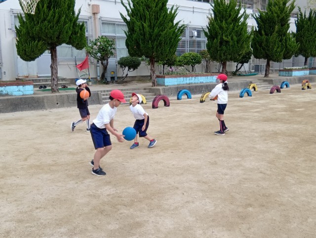 1組と3組合同で体育。7つの遊びを順番に巡っていました。グループごとに行動できていて、とってもテキパキしていました。