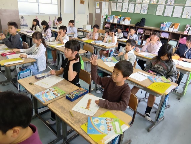 1組は英語。自分の名前を英語で書く練習をしていました。アルファベットが書きやすくなるよう4本線の入ったプリントを使って取り組んでいました。