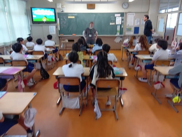 3組は英語。楽しい感じの歌を聞いて英語のリズムや発音に慣れ親しんでいました。歌の中のキャラクターが踊りながら歌っていたので、子どもたちも身体を揺らしながら歌ってました。