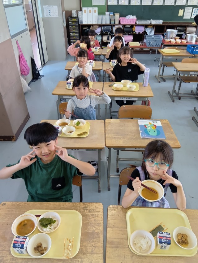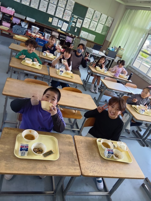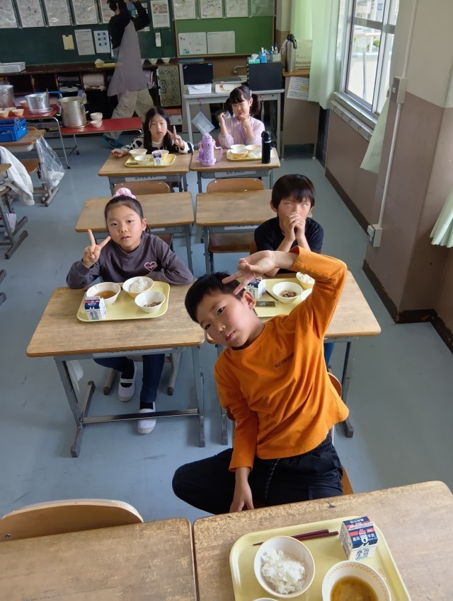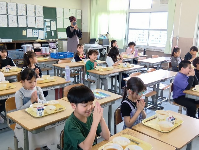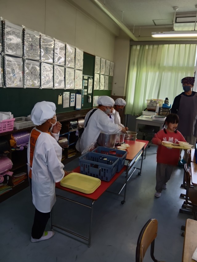 今日は3年生の給食のようすを見てきました。まずは1組。係の子たちが器にごはんやおかずを入れていました。
