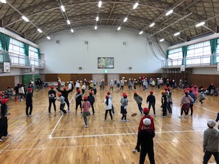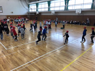 3年と5年の仲良し交流、給食終了後は体育館で「ドッチビー」です。分けたチームの組み合わせを変えたりして、一緒に遊ぶ時間をたくさん持ちました♪