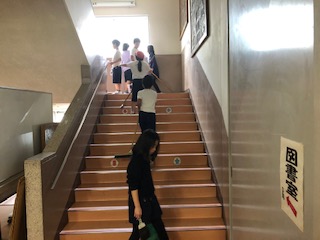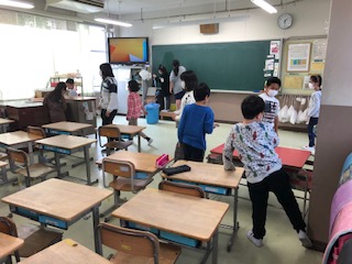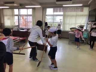 2年生と4年生は仲良し交流で一緒に掃除をしています。2年生の教室はに、4年生が来ています。2年生の掃除分担の階段にも4年生が来ています。