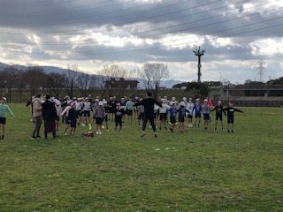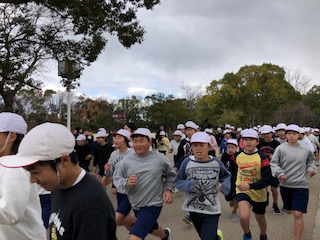 朝一番は晴れやかだった空が、にわかに曇り、雨がぱらつきました。6年生は、まず芝生広場で準備体操をしました。そしてスタートラインに並び、「よーい、スタート」、一斉に走り出しました。