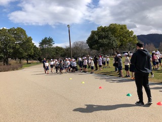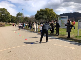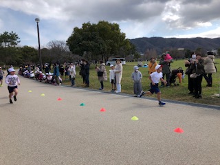 地面のカラー目印の右側はゴールコースです。次々にゴール、そして最後の人を応援してたくさんの人たちが伴走します。団体でゴール、温かいですね♪4年生は、途中止まる人やゆっくり歩く人がなく、全員が最後まで走り切りました。すごいガンバリを全員で見せました。