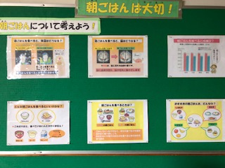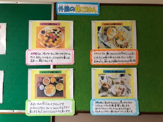 給食室横の掲示板です。読むと、どんなに朝ごはんが大切かわかります。外国の朝ごはんで紹介しているのはハワイ、メキシコ、ローマ、フランスです。どれも美味しそうです♪