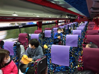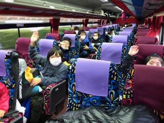 バスは、中国自動車道を走っています。1号車の様子です。穏やかで静かです。「手を振って」の声かけに起きている子たちが応えてくれました。