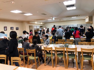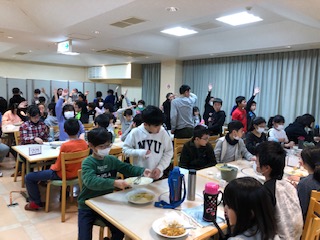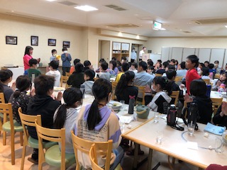 食事係が前に出て来て「ごちそうさま」、お皿を重ねた班から手を挙げて先生のチェックを受け、次々に部屋へ戻ります。