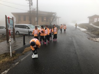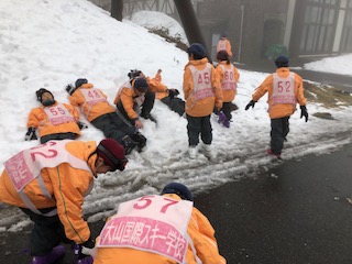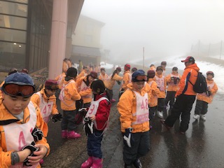 途中から雨が降り出し、視界も悪くなって来て、丁度今日のスキー教室が終わりました。雪に自分の人型を残したい人たち、明日も残っているかな〜。